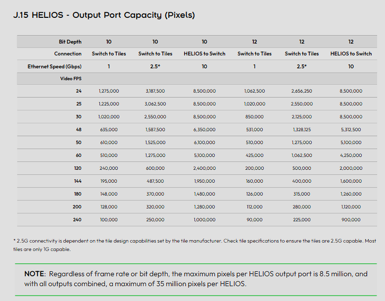 For this example, let's use a tile that is a 320 pixels wide by 320 pixel tall. The input will be 50hz / 12 bit using 1x stream. Below are a few key stats we know and will use for the calculation. I am also referencing a page of the HELIOS User Guide (Output Port Capacity table).